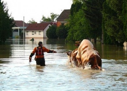 Na Twitteru je objavljena fotografija bika i krave (radeći ono što bik i krava znaju da rade…) i spasioca koji ih izvodi iz poplavljenog područja.