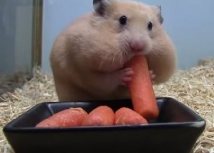 Ovaj simpatičan hrčak ima zaista zavidnu želju za hranom. Ne znamo je li toliko gladan ili jednostavno želi potrpati sve mrkvice u usta kako mu snimatelj slučajno ne bi neku od njih uzeo.
