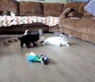Dva šteneta stara tek šest sedmica, Storm i Šedou, upoznaju jednog izuzetno strpljivog mačka po imenu Fin.