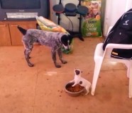 Sadie, malo štene, je pokazalo velikom Foxyu ko je gazda. Na presladak način je štitio zdjelicu s hranom.