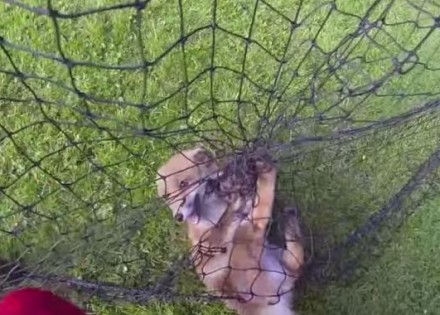 Mala lisica se uplela u ogradu od mreže. Iako joj je čovjek pružao pomoć i pokušavao da je izbavi, ona je od straha grizla njegove prste.