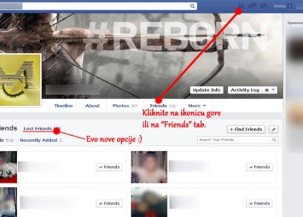 Instaliraj dodatak za Firefox ili Chrome, otiđi u listu prijatelja (Friends ikonica u gornjem desnom uglu kod Pretrage ili preko “Friends” taba – vidi sliku), i tamo ćeš naći novu opciju “Lost Friends”, u okviru koje ćeš vidjeti slike i imena “prijatelja” koji su te”otkačili” sa Facebooka!