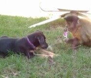 Šta se dešava kada pas i majmun navale na istu lizalicu? Dvije životinje su dijelile lizalicu, sve dok se majmun nije naljutio na psa iz nekog razloga i potom ga slatkišem udario po glavi.