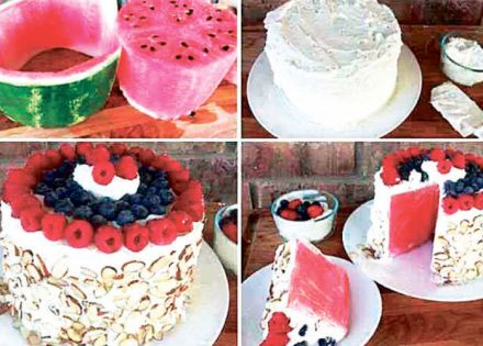 Na voće i šlag dodajte voće po izboru. Mi predlažemo maline i borovnice! Naravno, pustite mašti na volju, pa vašu tortu od lubenice premažite čokoladom i utistnite listiće koštunjavog voća sa strane.