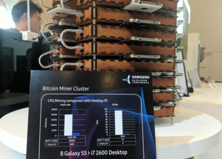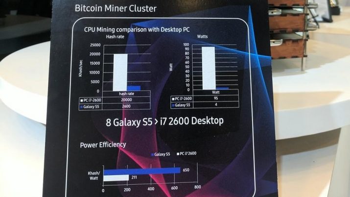 Na Samsung Developer Conference (Samsung Razvojna konferencija) demonstrirano je rudarenje Bitcoin-a pomoću 50 umreženih Galaxy S5 smartfona. Samsung je pošao od logike – zašto umreženi telefoni ne bi bili efikasni kao i PC koji namjenski pravimo za rudarenje, vrijedan najmanje 2.000 evra.