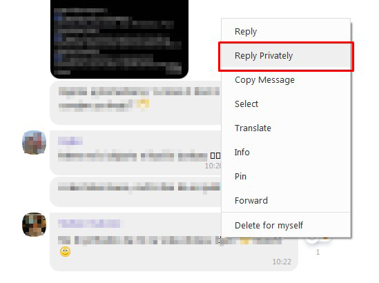 Klikom na novu opciju prelazi se u čet jedan na jedan i kopira se poruka iz grupnog četa na koju odgovarate, kako bi osoba iz grupnog četa mogla da zna na šta se odgovor tačno odnosi. Odatle je moguće nastaviti konverzaciju dalje od ostalih članova grupe.
