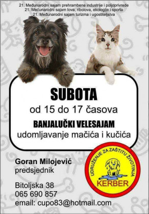 Udruženje za zaštitu životinja “Kerber” iz Banjaluke danas od 15 do 17 časova na banjalučkom Velesajmu organizuje humanu akciju udomljavanja kučića i mačića!