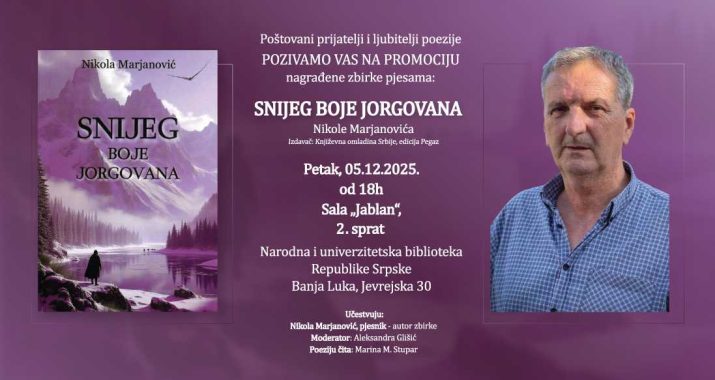 U Narodnoj i univerzitetskoj biblioteci Republike Srpske u Banjaluci biće održana promocija nagrađene zbirke pjesama “Snijeg boje jorgovana” autora Nikole Marjanovića.