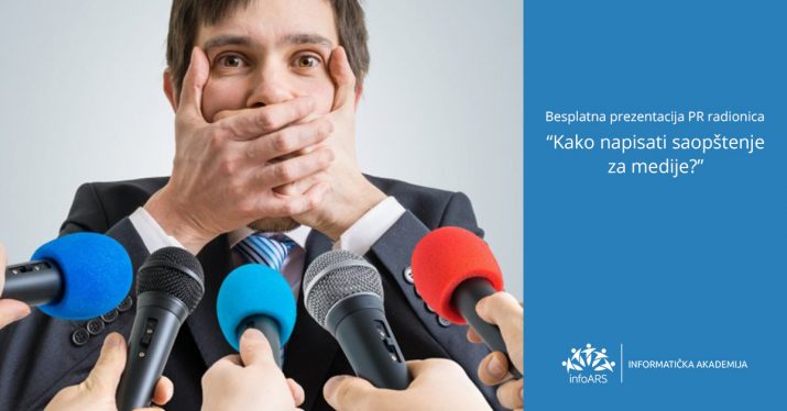 Besplatna prezentacija za najavu Radionice “Kako napisati saopštenje za medije?” održati će se 06.09.2018. u terminu od 19.15-20.15h u prostorijama InfoARS Akademije, na adresi Carice Milice 43, a voditelj radionice je Milorad Labus, urednik Portala banjaluka.com, dugogodišnji novinar najtiražnijih srbijanskih i hrvatskih novina, dugogodišnji direktor Marketing i PR službe beogradske Kompanije Novosti za područje BiH, te višegodišnji predsjednik Udruženja novinara UMNO RS.
