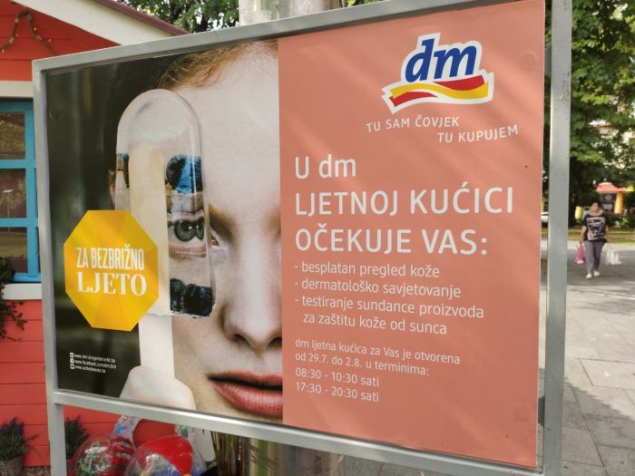 „DM već tradicionalno radi na zdravlju kože u ljetnjim mjesecima, odnosno trudi se da svojim aktivnostima potiče što veći broj građana na odgovornost i na odgovorno izlaganje suncu. U DM ljetnjoj kućici u kojoj sve posjetioce očekuje besplatan pregled kože, savjetovanje sa stručnjacima ali i građani će moći probati DM-ove proizvode za zaštitu od sunca“, rekla je Delić Kadrić.