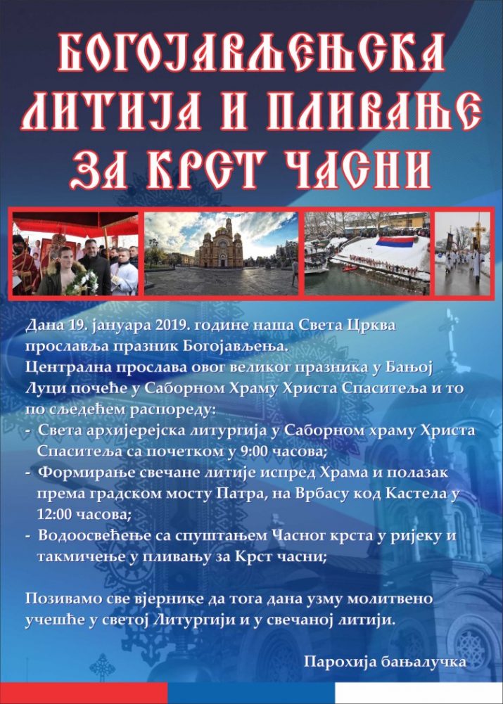Povodom velikog hrišćanskog praznika Bogojavljenja, u Banjaluci će u subotu, 19. januara, biti održana Bogojavljenska litija i plivanje za Časni krst.