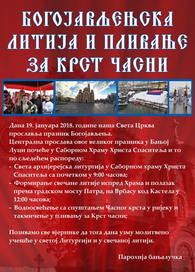 Povodom velikog hrišćanskog praznika Bogojavljenja, u Banjaluci će u petak, 19. januara, biti održana Bogojavljenska litija i plivanje za Časni krst.