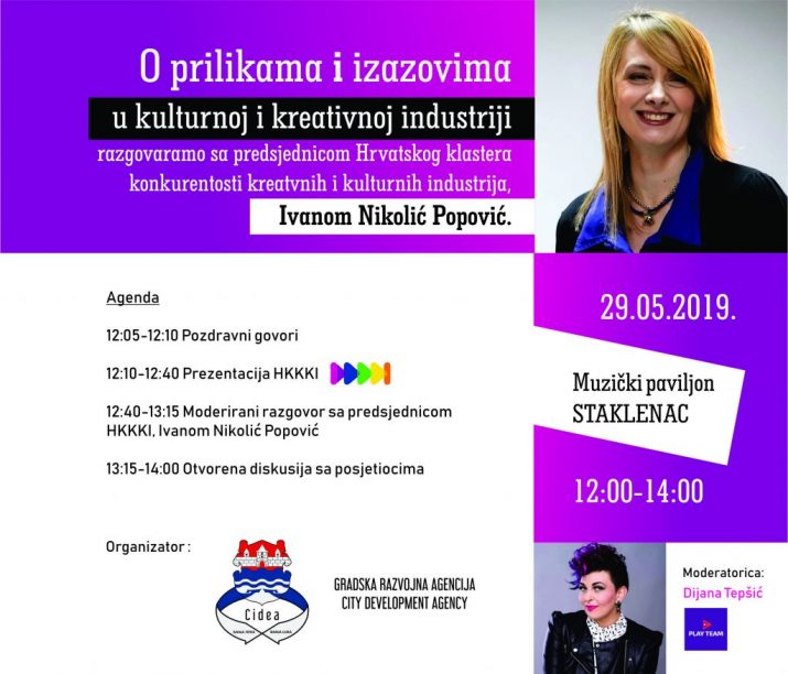 Gradska razvojna agencija organizuje Otvorenu diskusiju sa Ivanom Nikolić Popović, predsjednicom Hrvatskog klastera konkurentosti kulturnih i kreativnih industrija, koja će se održati 29. maja u muzičkom paviljonu “Staklenac” od 12 do 14 časova. Ivana će govoriti o prilikama i izazovima u kulturnoj i kreativnoj industriji, djelovanju kroz klaster, modelima finansiranja projekata i aktivnosti, kao i konkretnim primjerima projekata iz grada Zagreba. Želimo da upoznamo što veći broj aktera u kulturi i kreativnim industrijama Banjaluke, kako bi se u budućnosti kroz povezivanje ostvario što značajniji potencijal u realizaciji projekata i jačanju kreativne industrije.