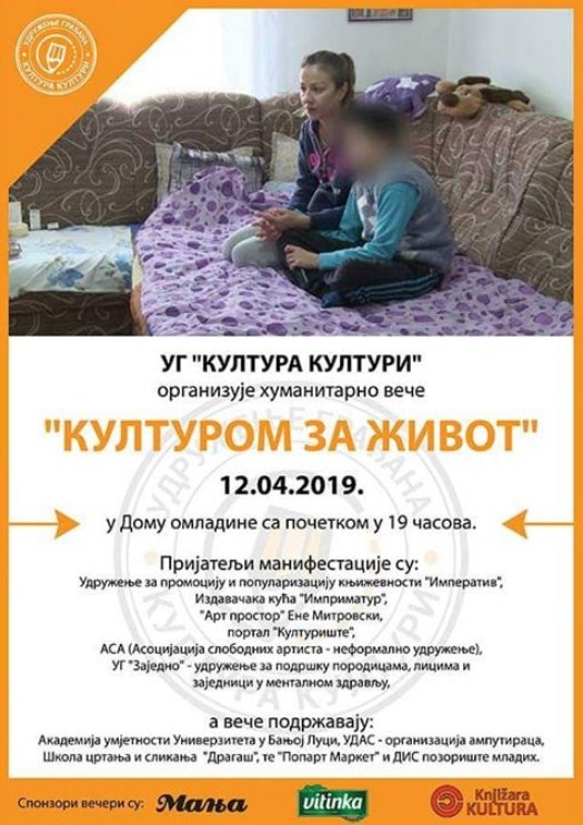 “Kulturom za život” naziv je humanitarne večeri koju 12. aprila u banjalučkom Domu omladine organizuje udruženje “Kultura kulturi”. Cilj je prikupljanje novca za liječenje teško oboljele Snježane Plavšić i njenog desetogodišnjeg sina. Događaj počinje u 19 časova.