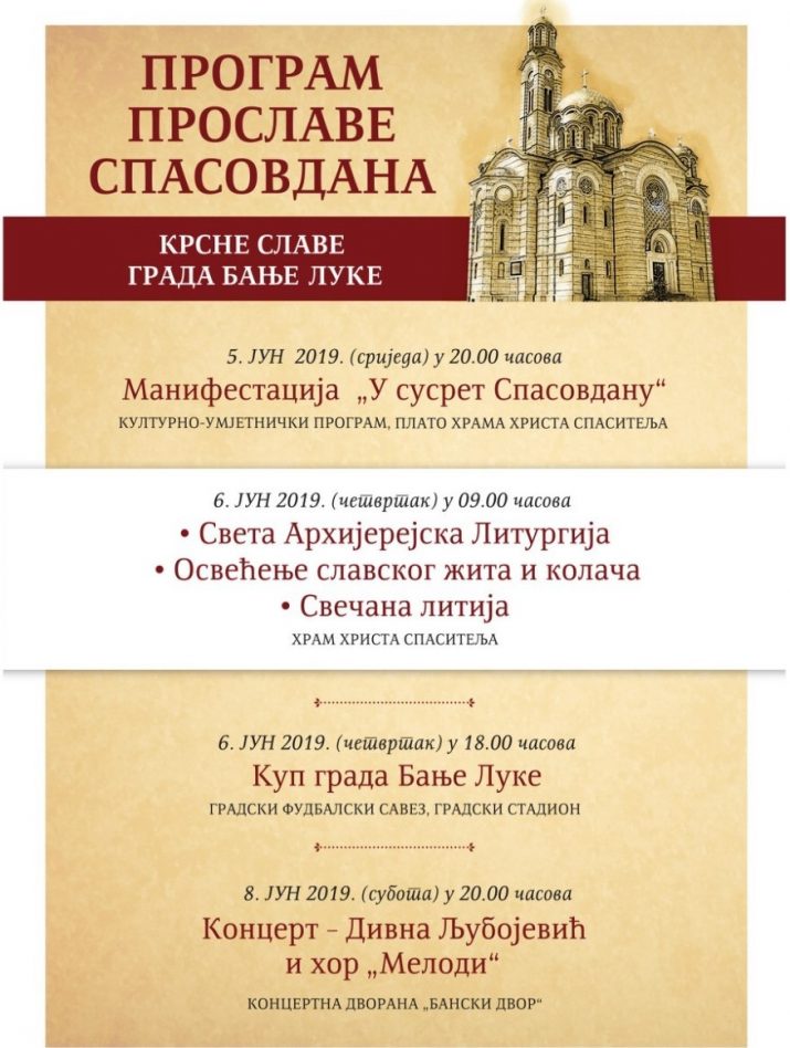 Program obilježavanja Spasovdana počinje u srijedu, 5. juna, u 20 časova, kada će na platou ispred Hrama Hrista Spasitelja biti održan kulturno – umjetnički program pod nazivom “U susret Spasovdanu”.