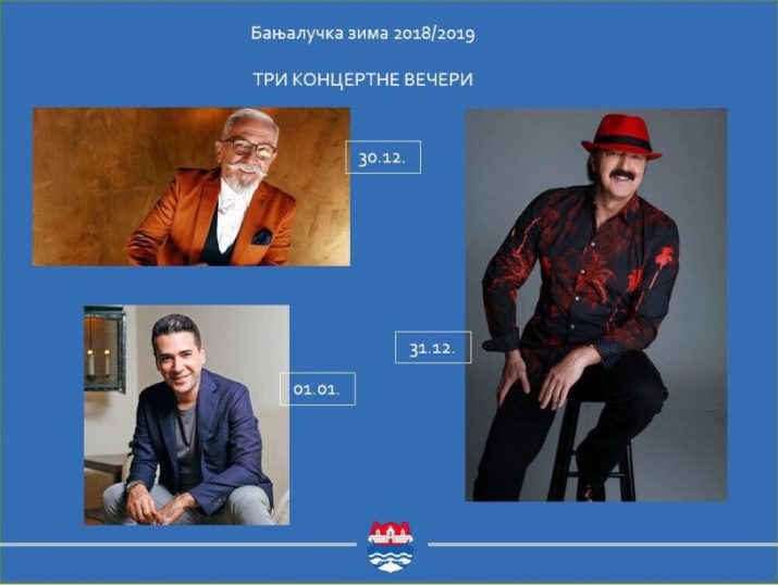 Novogodišnju proslavu u gradu obilježiće tri koncerta na kojima će nastupiti regionalne zvijezde Haris Džinović, Željko Samardžić, Željko Joksimović i Nikola Rokvić, najavio je to gradonačelnik Igor Radojičić na svom “Fejsbuk” profilu.