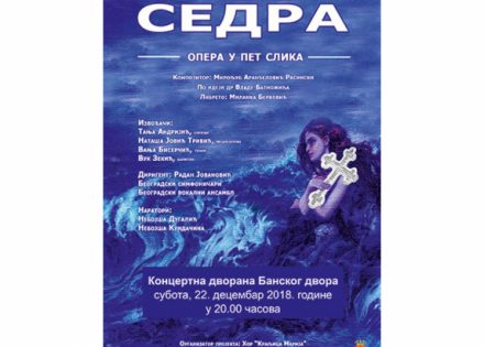 Povodom obilježavanja stogodišnjice završetka Prvog svjetskog rata, udruženje “Hor kraljica Marija” u saradnji sa Banskim dvorom Kulturnim centrom organizuje premijeru koncertnog izvođenja nove nacionalne opere “Sedra”, kompozitora Miroljuba Aranđelovića Rasinskog, koja će se održati sutra u Koncertnoj dvorani Banskog dvora Kulturnog centra s početkom u 20 časova.