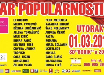 Queen estrada u utorak, 01. marta 2016. godine u 20 časova u Sportskoj dvorani “Borik“ organizuje Oskar popularnosti.