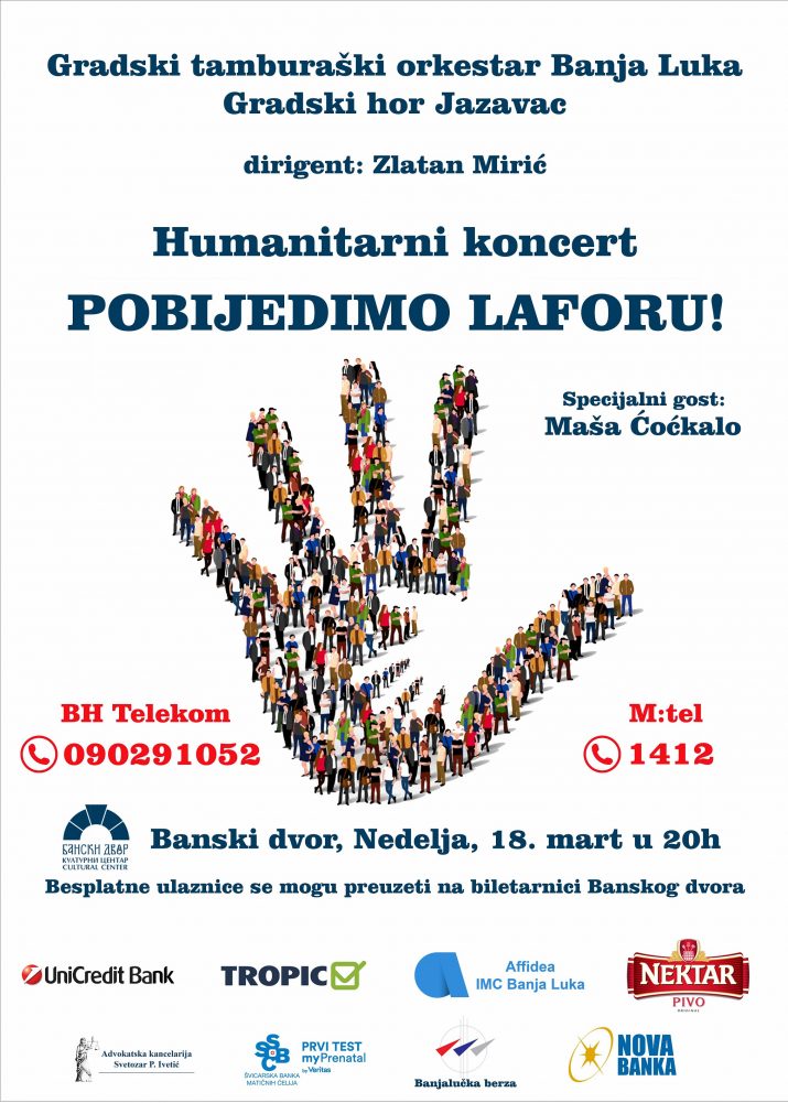 U nedelju, 18. marta, sa početkom od 20.00 časova, u Banskom dvoru biće održan humanitarni koncert pod nazivom “Pobijedimo Laforu”. Organizator koncerta je Gradski tamburaški orkestar, uz koga će učestvovati Gradski hor Jazavac, pod dirigentskom palicom Zlatana Mirića.