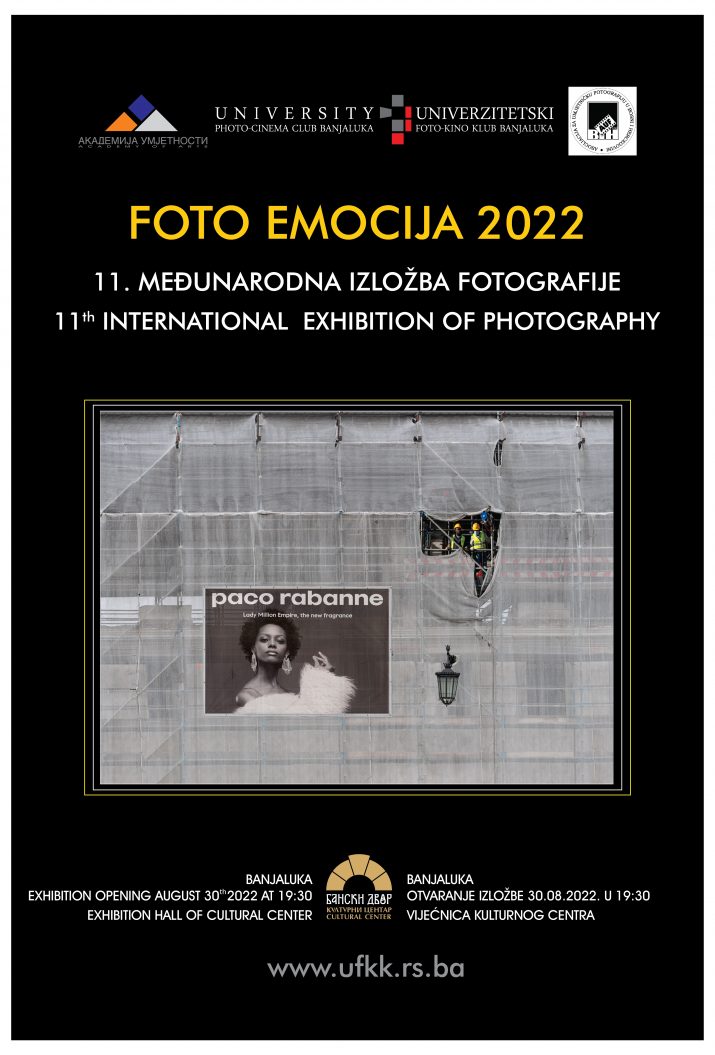 Kako su saopštili iz Univerzitetskog foto kino kluba Banjaluka, za 11.Međunarodnu izložbu Foto Emocija 2022 pristiglo je 2.870 fotografija od 195 autora iz 46 zemalja.