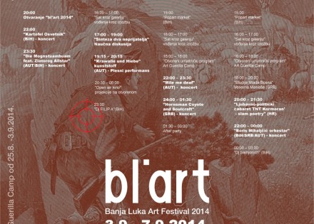 Guerilla Art Camp se bliži kraju, te su građani Banjaluke imali mogućnost da posmatraju čak dva performansa na Trgu Krajine, koja su se dogodila 29. avgusta u 18 časova. Performansi su bili pucanje na svetske lidere banjalučkog umetnika Nikole Kekerovića, te „vojni apsurd“ srpske/poljske umetnice Ade Kobusiewicz, srpsko/austrijskog umetnika Igora Friedrich-a Petkovića i austrijskog umetnika Stefan Schimd-a. Podsećamo da će svi radovi iz Guerilla Art Camp-a biti izloženi u toku BL’ART Festivala, čiji je program vezan za izložbe, diskusije i druge kreativne trenutke sledeći: