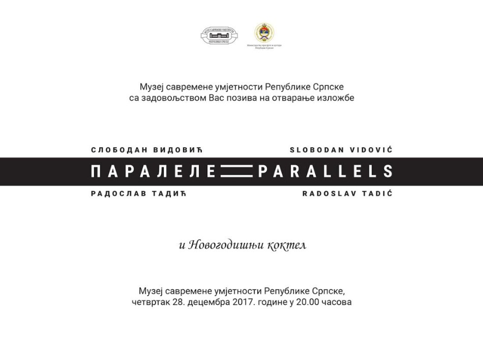 U Muzeju savremene umjetnosti Republike Srpske, u četvrtak 28. decembra 2017. godine u 20 časova, biće otvorena izložba “Paralele” Slobodan Vidović/Radoslav Tadić.
