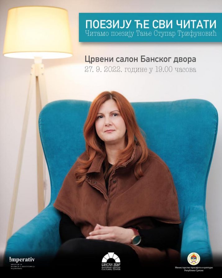 “Prvi susret sa našom publikom zakazujemo 27. septembra u 19.00 časova u Crvenom salonu Banskog dvora, kada ćemo u programu “Poeziju će svi čitati” čitati poeziju Tanje Stupar Trifunović. Do sada je u okviru ovog programa publika bila urednik, birala i čitala poeziju autora iz regiona, a ovaj put odlučili smo da u fokusu bude poezija Tanje Stupar Trifunović”,  navedeno je u saopštenju “Imperativa”.