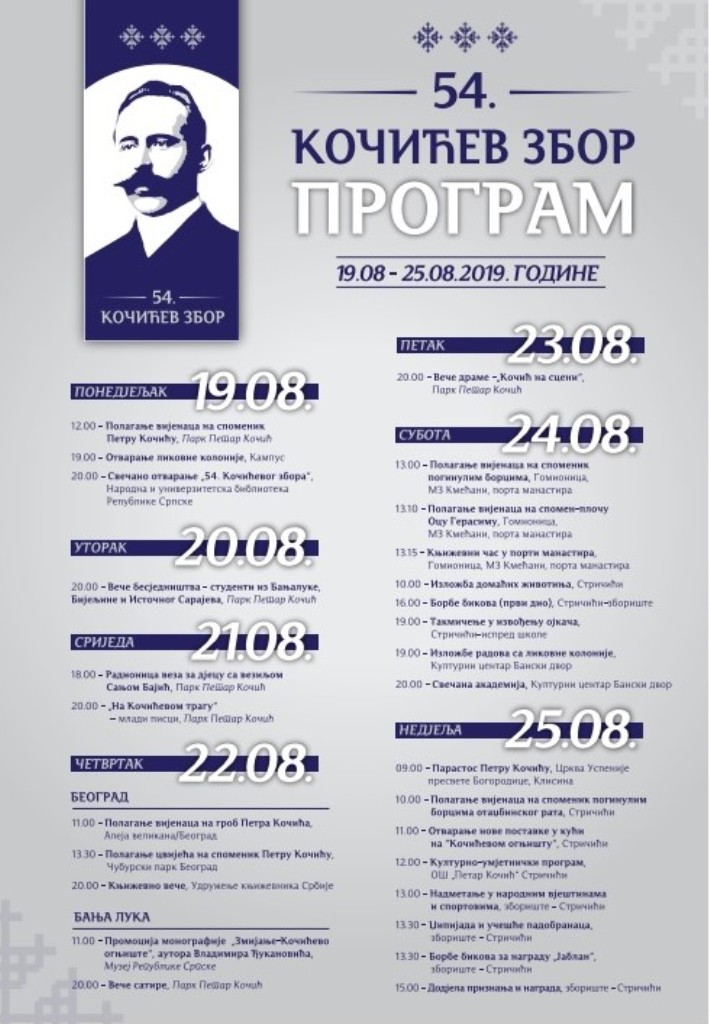 Ovogodišnja manifestacija posvećena narodnom tribunu Petru Kočiću, 54. „Kočićev zbor“ počinje u ponedjeljak 19. avgusta i traje do 25. avgusta.