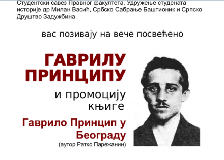 Studentski savez Pravnog fakulteta, Udruženje studenata istorije dr Milan Vasić, Srbsko Sabranje Baštionik i Srpsko Društvo Zadužbina organizuju veče posvećeno Gavrilu Principu i promociju knjige “Gavrilo Princip u Beogradu” autora Ratka Parežanin.