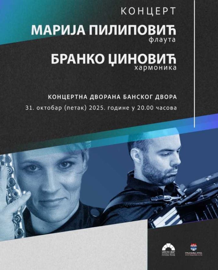 U Koncertnoj dvorani Kulturnog centra Banski dvor u petak 31. oktobra u 20.00 časova biće održan koncert Marija Pilipović (flauta) i Branka Džinovića (harmonika).