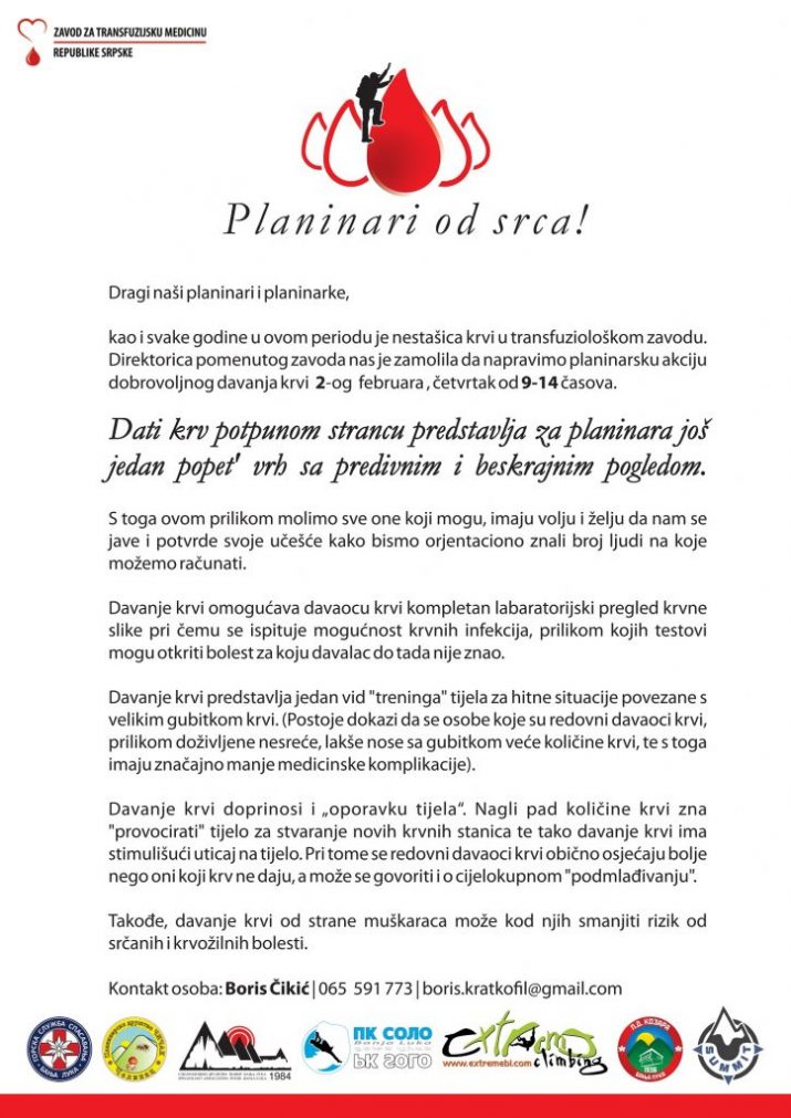 Gorska služba spasavanja učestvovaće u zajedničkoj akciji dobrovoljnog davanja krvi “Planinari od srca” zajedno sa sedam penjačkih i planinarskih društava 2. februara u Zavodu za transfuzijsku medicinu.