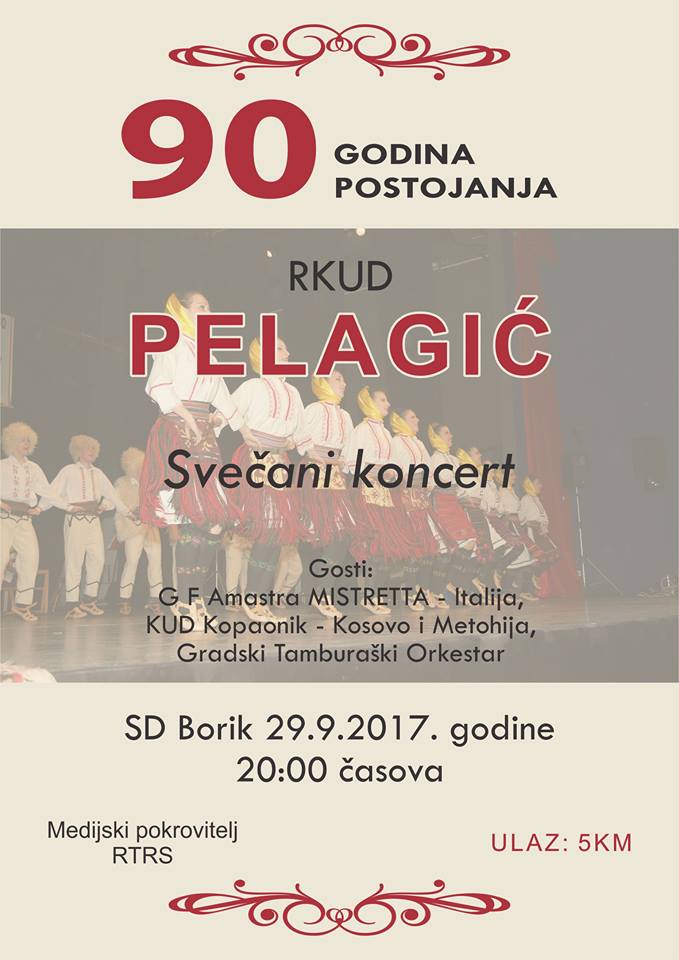 U okviru obilježavanja jubileja – 90 godina postojanja i rada, RKUD “Pelagić” će održati svečani koncert u dvorani Borik, u petak 29. septembra, sa početkom u 20.00 časova.