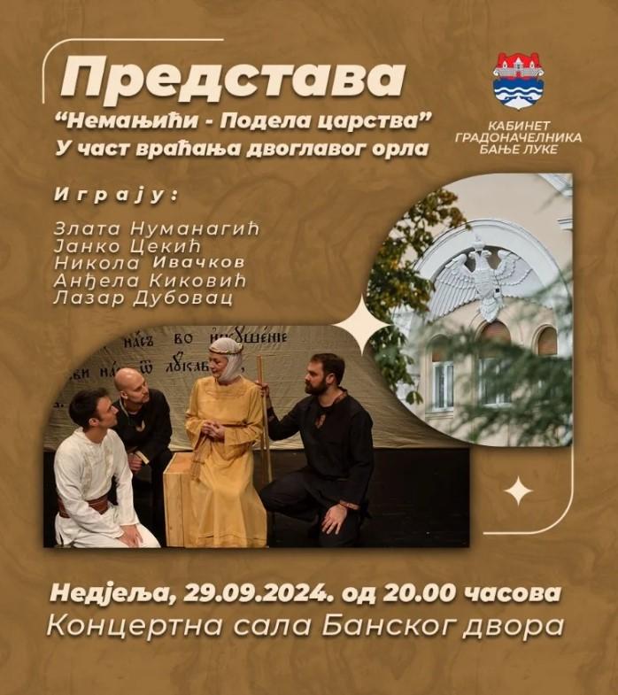 Predstava „Nemanjići – podela carstva“ u čast vraćanja dvoglavog orla na zgradu Banskog dvora biće održana u nedjelju, 29. septembra.