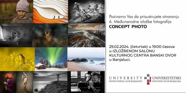 Šesta Međunarodna izložba fotografije “Concept photo” biće otvorena u četvrtak 29. februara u izložbenom salonu Kulturnog centra Banski dvor.