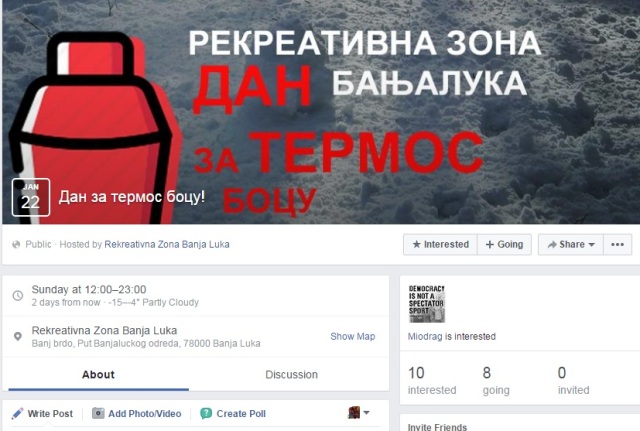 Inicijativa građana Rekreativna zona Banjaluka, poziva sve građane i građanke, putnike namjernike, goste iz drugih mjesta da u nedjelju 22.1. iskoriste sunčan i prohladan dan i da zajedno sa svojim najmilijim ljudima i životinjama/biljakama prošetaju svoje termos boce, čuturice, pljoske, boce svih vrsta i provedu aktivno i kvalitetno svoje slobodno vrijeme.