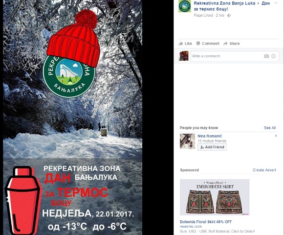 U nedjelju 22.1. se najavljuje fin i sunčan dan, temperatura od -13 do -6, idealno vrijeme da nađete vaše zaboravljene termos boce i razne čuturice, napunite ih omiljenim toplim napitkom čajem, kafom, kuhanim vinom/rakijom, sokom, vodom i prošetate u Rekreativnoj zoni Banjaluka.