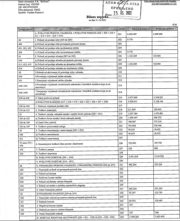 Borac je u godini iza nas ostvario prihode od 6.229.687 KM, te rashode u iznosu od 3.028.031 KM.
