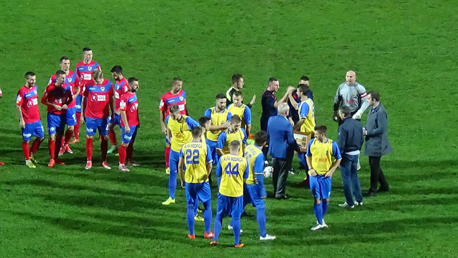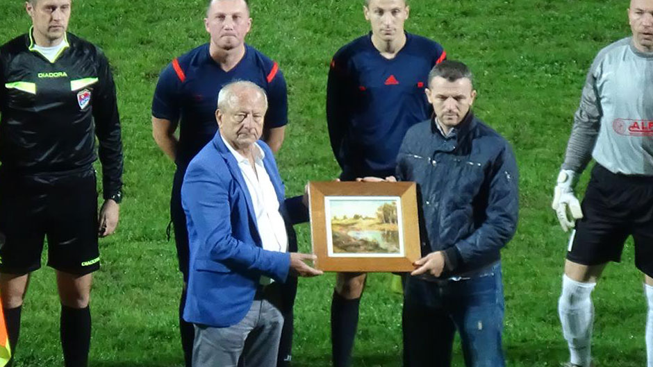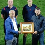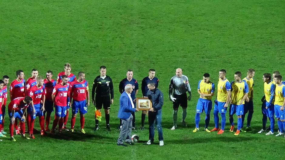 Potpredsjednik Alfa Modriče Ilija Jevtić pred početak susreta uručio je umjetničku sliku direktoru Banjalučana Oliveru Jandriću.