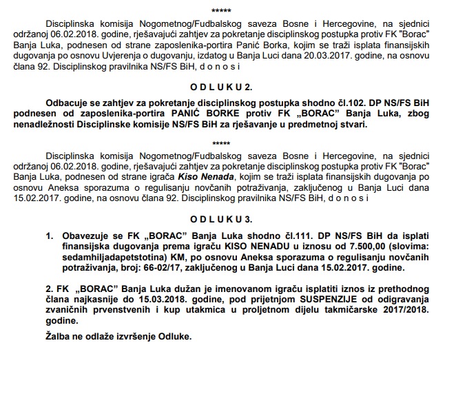 U zvaničnim dokumentima Fudbalskog saveza Bosne i Hercegovine piše da su zahtjeve protiv Borca podnijeli brojni fudbaleri i bivši zaposlenici kluba, kojim će banjalučki klub zahvaljujući odluci Disciplinske komisije morati da isplati potraživanja i to najkasnije do 15. marta 2018. godine.
