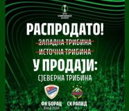 Borac u četvrtak 6. marta igra jednu od najvećih utakmica u klupskoj istoriji, a karte za istočnu i zapadnu tribinu su već rasporade, potvrdio je klub na društvenim mrežama. U prodaji su ostale još ulaznice za sjevernu tribinu, a njih