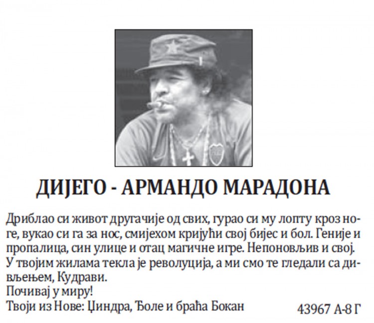U galeriji pogledajte još neke čitulje kojima su se Banjalučani oprostili od neponovljivog Maradone.
