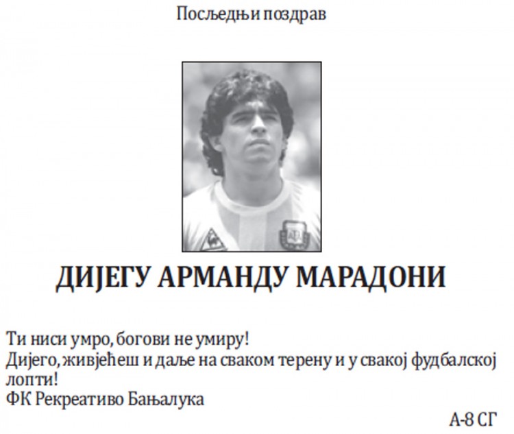 “Ti nisi umro, bogovi ne umiru! Dijego, živjećeš i dalje na svakom terenu i u svakoj fudbalskoj lopti”, stoji u čitulji Fudbalskog kluba Rekreativo.