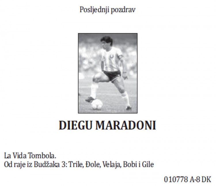 “La Vida Tombola. Od raje iz Budžaka”, piše u oproštaju od Maradone koji su potpisali Đole, Trile, Velaja, Bobi i Gile.