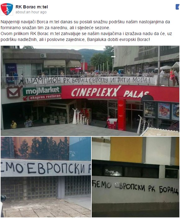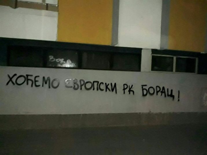 Navijači Rukometnog kluba Borac m:tel transparentom i grafitima poručili banjalučkoj javnosti da žele nastup crveno-plavih u međunarodnim takmičenjima.