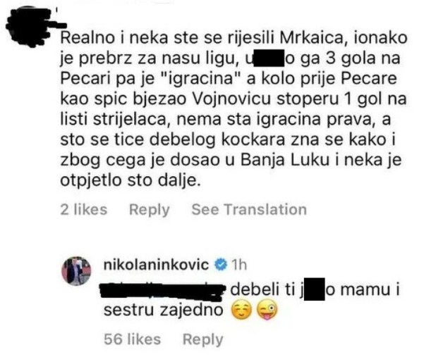 Ninković, koji je i ranije znao ući u sukobe i svađe s navijačima preko društvenih mreža, to nije prećutio pa je opsovao navijaču koji je to napisao, prenosi “Klix”.
