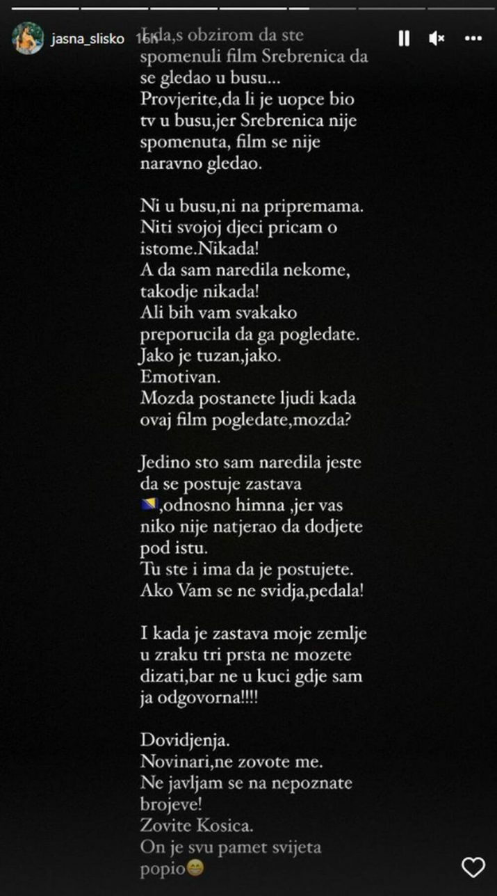 “Jedino što sam naredila jeste da se poštuje zastava Bosne i Hercegovine, odnosno himna, jer vas niko nije natjerao da dođete pod istu. Tu ste i ima da je poštujete. Ako vam se ne sviđa, pedala! I kada je zastava moje zemlje u vazduhu, tri prsta ne možete dizati, bar ne u kući gdje sam ja odgovorna” – poručila je Jasna Sliško putem Instagrama.