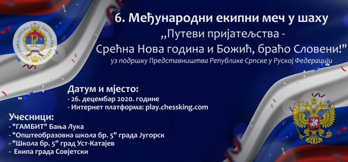 U okviru potpisanog sporazuma o saradnji u oblasti šahovskog obrazovanja, između Centra za unapređenje i razvoj šaha „Gambit“ iz Banjaluke i „Srednje škole za opšte obrazovanje br. 5“ grada Jugorsk (Ruska Federacija), 26. decembra 2020. godine je na programu prvi online ekipni šahovski meč na 8 tabli/računara.