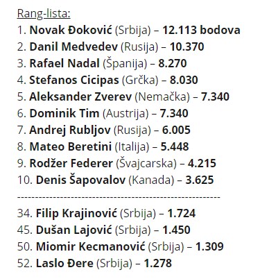 U prvih 10 su još Aleksandar Zverev, Dominik Tim, Andrej Rubljov, Mateo Beretini, Rodžer Federer i Denis Šapovalov.