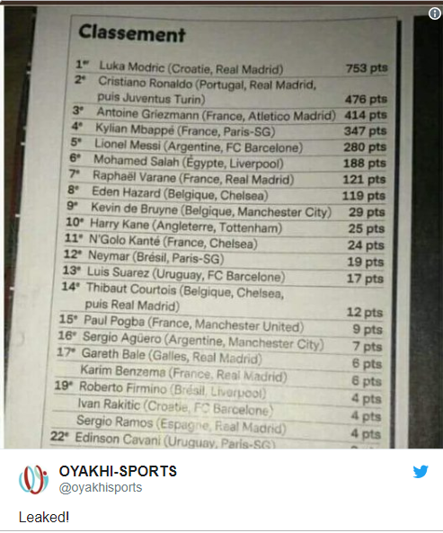 Modrić je, navodno, osvojio Zlatnu loptu sa 753 poena, značajno ispred drugoplasiranog Kristijana Ronalda, koji je osvojio 476 poena.