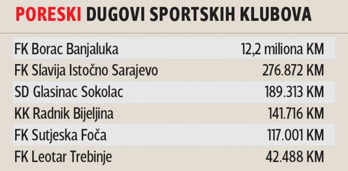 Tako su fudbalski klubovi postali finansijski teret državi za koji niko ne predlaže konkretna rješenja. Dugovi postaju sve veći, a obaveze se prolongiraju iz godine u godinu. Trenutno Poreskoj upravi duguju gotovo 13 miliona maraka. To se, prije svega, odnosi na fudbalske klubove.